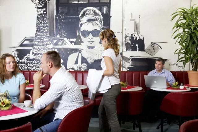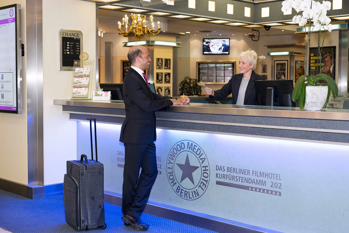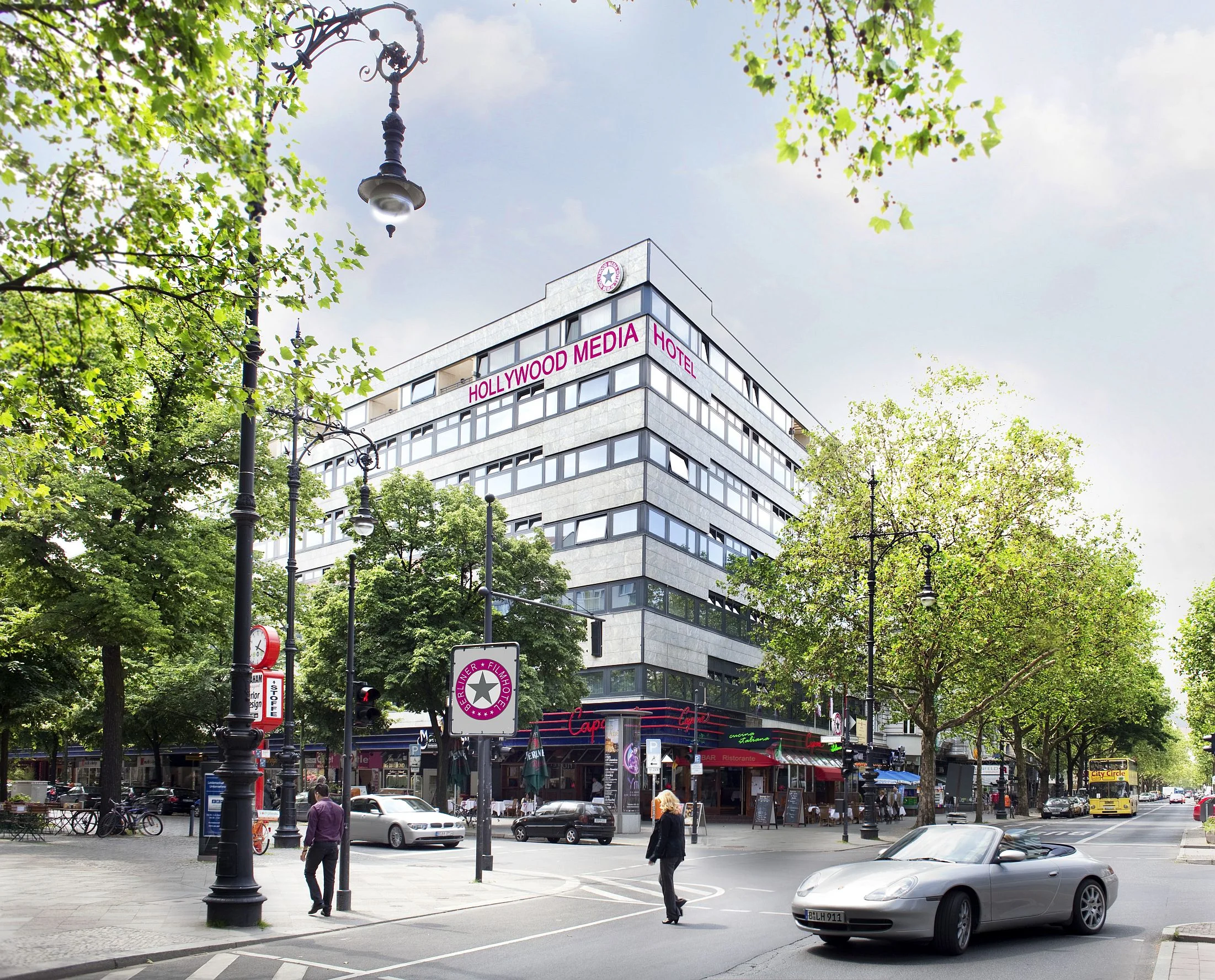 Das Hollywood Media Hotel Berlin, direkt auf dem Kurfürstendamm gelegen, ist eine Hommage an den Film, internationale Stars und unvergessene Filmlegenden. Als Privathotel überzeugt das mit 4 Sternen ausgezeichnete Haus durch ein individuelles und familiäres Ambiente und ist gleichwohl beliebt bei Städte- sowie Geschäftsreisenden. Die Lage des einzigartigen Themenhotels direkt auf der bekannten Shoppingmeile, in unmittelbarer Nähe zum Zool. Garten, der berühmten Gedächtniskirche und nur wenige Minuten vom Potsdamer Platz entfernt, schafft den idealen Ausgangspunkt für eine Entdeckungstour durch die pulsierende deutsche Hauptstadt. Die dem Hotel angeschlossene Bar Callas ist ganz im Stil der American Sixties eingerichtet. Bei einem Cocktail unter dem schwarz-weiß Portait von Audrey Hepburn in "Breakfast at Tiffany's" schweift der Blick auf das lebendige Treiben des Kurfürstendamm.