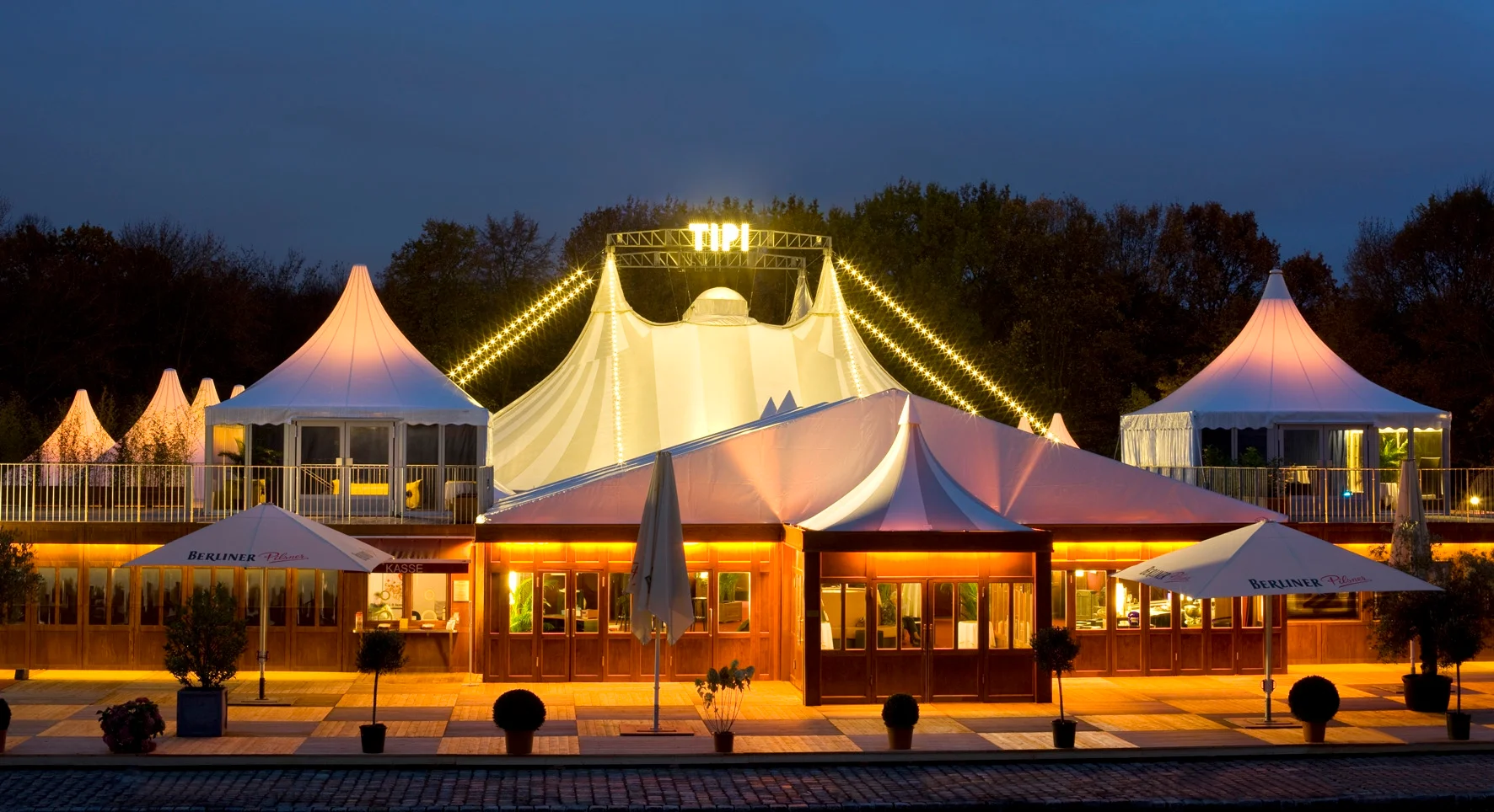 TIPI AM KANZLERAMT – That'sEntertainment! Dem Zentrum der Macht ganz nah – direkt neben dem Kanzleramt, in der neuenimposanten Mitte Berlins und doch mitten im Grün des Tiergartens steht das TIPIAM KANZLERAMT. Seit 10 Jahren erlebt man hier allabendlich nationale undinternationale Künstler der unterschiedlichsten Genres – Entertainment im Großstadtformat. Die Wandelbarkeit des luftigen Baus hat das TIPI zur attraktiven und begehrtenLocation für exklusive Events gemacht. Ein großer Außenbereich mit Biergartenbietet im Sommer die vielfältigsten Möglichkeiten zum Feiern unter dem BerlinerSternenhimmel.