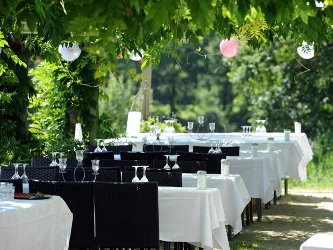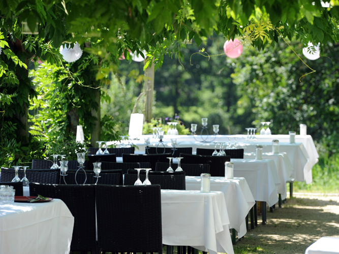 Altes Gärtnereigewächshaus mit Ziegelboden mitten in einem großzügig angelegten Park. Zwei Gasträume in einem alten Stallgebäude und ein weiterer Raum in einem modernen Glashaus. Bei schönem Wetter gibt es Im Garten viele lauschige Plätze.